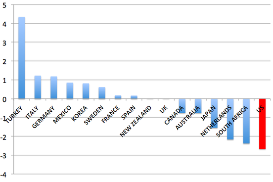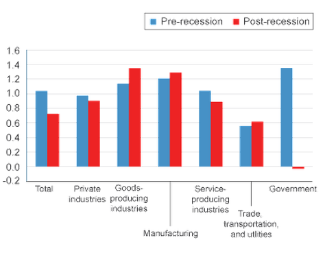 We're adding lots of jobs in industries with stagnant wages, and a few jobs in industries with rising wages, according to new research out of the Cleveland Fed. "It may seem counterintuitive that wages and salaries are growing the slowest in industries where jobs are growing the fastest, but it actually is not," writes LaVaughn M. Henry, vice president of the bank's Cincinnati branch. We're adding few jobs in goods-producing industries like manufacturing, which have the highest overall post-recession wage growth, and lots of jobs in service-producing industries (e.g. health care, leisure and hospitality, and education), which have the lowest real wage growth.