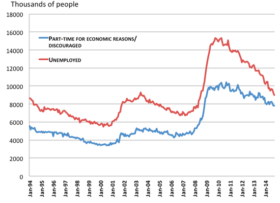 It's a problem best summed up by Matthew O'Brien in the Washington Post. As the labor market approaches full employment, there should be more pressure on wages to rise. In the graph below, that would look like a trend-line pointing up and to the left. Instead, as you can see in a half-a-second glance, the trend-line is a blob and it's certainly not pointing up. The unemployment rate has fallen below 6 percent, and earnings growth is flat.