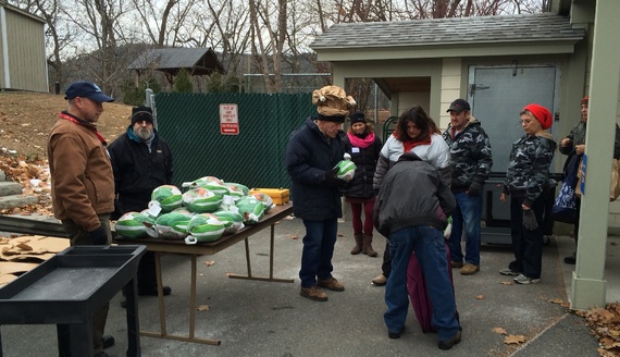 "The minimum wage is important to raise, but it's not an economic policy," he said, as families trickled by, awaiting their turkey, wrapped in green and white. "You've got the divergence between really high corporate profits but stagnant wages, and when you have stagnant incomes with costs continuing to increase, people are going to suffer immensely."