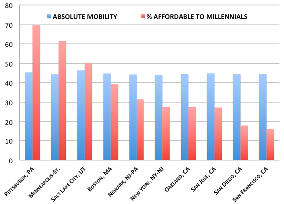 There are the only three cities in the United States with (a) at least 50 percent of houses affordable to middle-class Millennials and (b) a top-10 finish in Chetty's mobility calculations. These are the outliers: Pittsburgh, Minneapolis, and Salt Lake City.