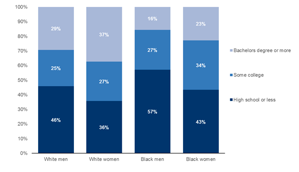 According to a recent memo from Brookings Institution, when looking at married women ages 25 to 35, about 41 percent of white women had husbands who had similar educational-attainment levels, while only 32 percent of married black women could say the same. About 48 percent of white women reported having husbands with lower levels of educational attainment, while nearly 60 percent of black women had married someone with less education under their belt. That discrepancy could result in a household that earns about $25,000 less each year, according to Brookings.