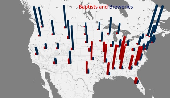 What Gohmann found is a correlation, of course, but it's a convincing one. There's no counter-argument that Southerners simply don't like beer: Louisiana happens to be the state with the 10th-highest beer consumption per capita, and South Carolina isn't far behind. And while there are other religious groups—Mormons and Muslims, to name two—that abstain from alcohol and live in high concentrations in areas with lots of breweries, those groups, unlike Baptists, take firmer stances on what they themselves can drink than on what others are allowed to.