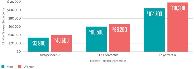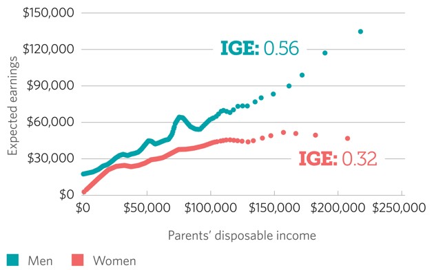 Interestingly, this effect is much stronger for men than women. When it comes to individual earnings, men have an IGE of 0.56, meaning they retain a lot more of their parents’ advantages than do women, whose IGE is 0.32.