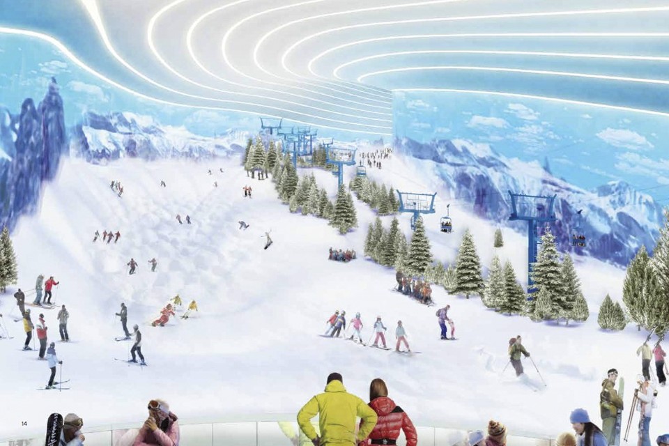 In 2017, its developers say, the American Dream will open with “the largest mix of indoor facilities in the world,” according to its slick website, offering millions of visitors “the ultimate family experience.” It will have 400 stores and restaurants, a DreamWorks-themed amusement park and waterpark, an indoor ski slope (that’s the orange snout), an aquarium, mini-golf course, and theater. The 4.8-million-square-foot complex will feature “the world’s first exclusive kosher food hall” and a giant ferris wheel looking onto the New York skyline.