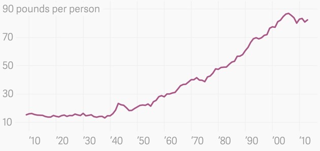 Americans love chicken. On a sandwich, in a nugget, or even as a bread replacement. In the past 50 to 60 years, chicken has gone from a seasonal food usually enjoyed in the summer to an ever-present one. Its availability, a proxy for consumption, has nearly tripled since 1965, making it now the most popular meat in the U.S.