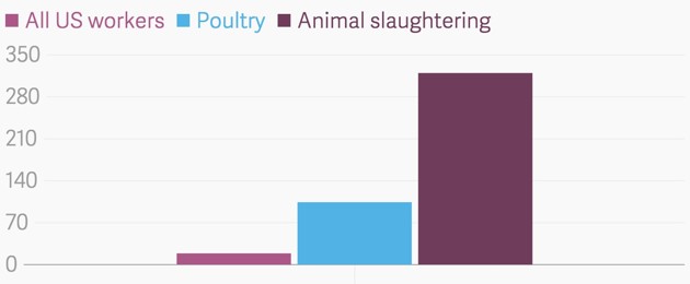 Poultry workers are also more than twice as likely as the rest of the workforce to get an amputation.