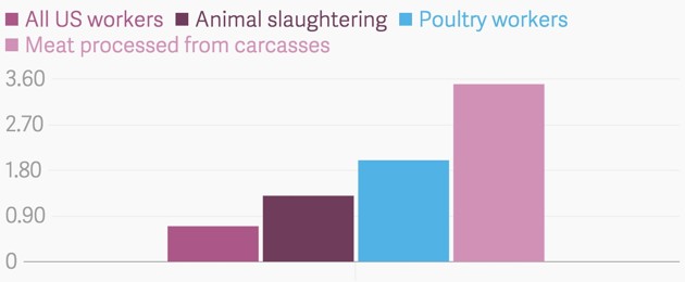 The report cited statistics from the Bureau of Labor Statistics and Occupational Health and Safety Administration (OSHA) showing how dangerous poultry-processing jobs are compared to the rest of American jobs. In 2013, the rate of non-fatal occupational illnesses, including common musculoskeletal disorders such as carpal tunnel syndrome, was 18.8 per 10,000 workers in the U.S. For poultry workers, it was 104.2.