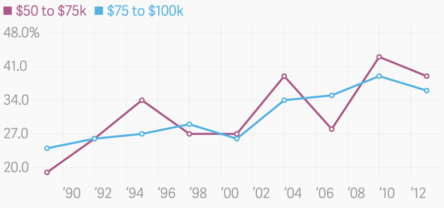 Even a relatively high earner who has been working many years typically only has $70,000 in financial assets, which isn’t even a year’s salary for a high earner. That’s just the average—about 25 percent of upper-middle-class 40- to 55-year-olds have less than $17,500 in financial assets. Financial assets trended up in the 1990s, and have nearly recovered since the financial crisis. But one reason asset balances went up is the increased popularity of 401(k) plans. In the 1980s, companies saved for their employees through defined-benefit pensions. Now, people do it for themselves.