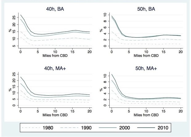 First, the researchers found a rising share of full-time workers with a college degree in the top cities—a trend led by the growth of women in the labor force. By 2010, the share of full-time workers with at least a bachelor’s degree was 24 percent higher in the center than the periphery, and the share of those with a master’s was 50 percent higher. Preference for centrality was even more pronounced among those working especially long hours (50 or more a week), according to the researchers.