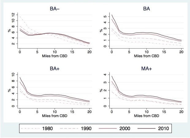 The scholars rest their case on a series of Census analyses. They focused on survey data from 27 heavily populated U.S. cities, expanding outward from central business districts to the tracts surrounding these areas up to 35 miles away. Altogether the sample consisted of 65,000 or so points of observation between 1980 and 2010.