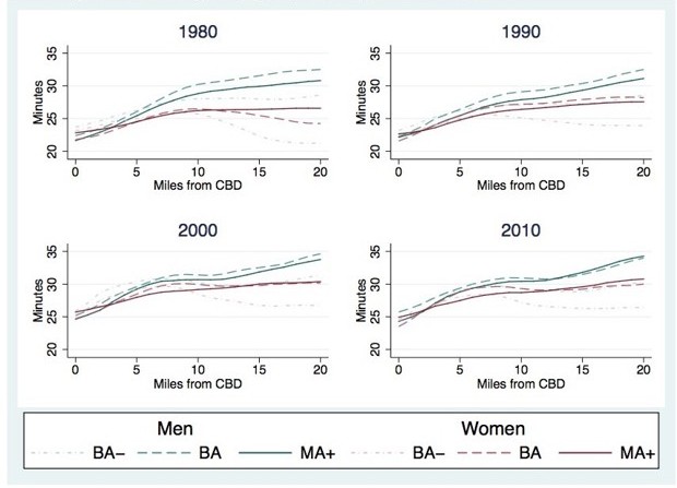 Duration of Commute Over Time, by Sex, Education, and Distance From City Center