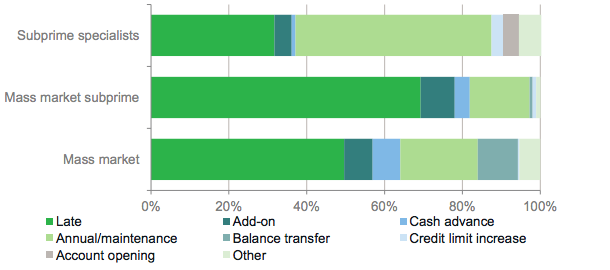It might seem easy to write off some of the discrepancies between these fringe card-issuers and mainstream banks because mainstream banks aren’t dealing with risky borrowers who regularly fall behind on their payments. But the report shows that that’s simply not the case. The CFPB found that compared to subprime card owners at major financial institutions, customers of these specialized subprime card services faced more onerous fees and trickier financial language. And these specialized shops don’t serve nearly as many subprime clients as more established brands do. According to the CFPB’s estimate, fringe subprime services account for less than a quarter of all credit-card accounts among Americans with subprime credit scores.