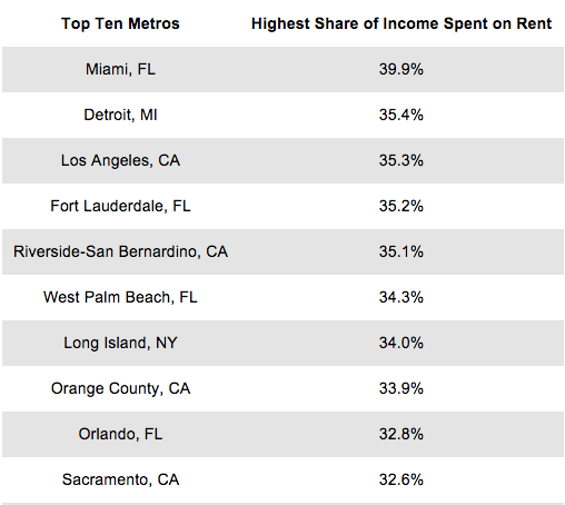 Here, an interesting pattern arises. Aside from L.A., the places with the highest rent burdens are Sunbelt tourist- and service-oriented metros like Miami and Orlando or hard-hit Rustbelt metros like Detroit, where incomes are already low.