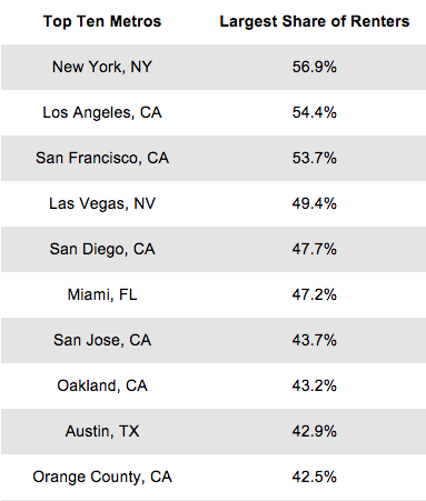 The transition overall is led by large, dense, superstar cities like New York and L.A., as well as knowledge and tech hubs like Boston, Seattle, Austin, and San Francisco and Silicon Valley, among others. These metros have some of the largest shares of renters compared to homeowners. In fact, there are three metros where more than half of households rent: New York, L.A., and San Francisco.