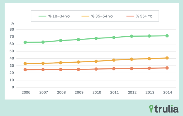 But renting was up among all age groups, as the chart above shows. The share of renters increased from 33 to 40.7 percent among households ages 35-54. Trulia speculates that this group may have been hard hit by job loss and foreclosure during the crisis. Renting also increased, from 24.4 to 27 percent, among Americans aged 55 and older.