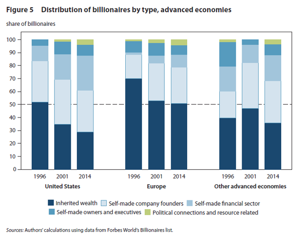 But perhaps the biggest shift over the past two decades has been the rise of self-made billionaires, especially in the United States and emerging economies. Self-made wealth accounted for nearly 70 percent of billionaire wealth in 2014, up significantly from 45 percent in 1996, as the chart below shows.