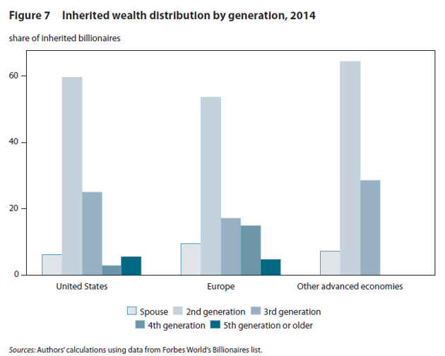 There is a staggering geographic divide in self-made versus inherited wealth across the world. American billionaires are far more likely to be self-made than their European counterparts, who are more likely to have inherited their wealth. As of 2014, more than half of European billionaires inherited their wealth, compared to just a third of billionaires in the U.S. European fortunes are also much more likely to date back over multiple generations, as the chart below shows. Over 20 percent of Europe’s inherited fortunes were four or more generations old, compared to less than 10 percent in the U.S.