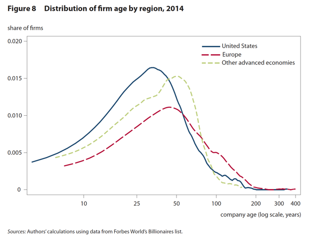 This divide is also reflected in the fact that the companies to which European billionaires are attached are considerably older than their U.S. counterparts. The median age of these European corporations is 91, compared to 76 for their American peers. The overall median age of a European billionaire’s business is 61, compared to 42 for their American peers—a difference of nearly 20 years. In fact, the report finds “a notable absence of any businesses established [from 2008-2014] in creating extreme wealth in Europe.” Meanwhile, the median fortune in the U.S. remained fairly consistent from 2001 to 2014.