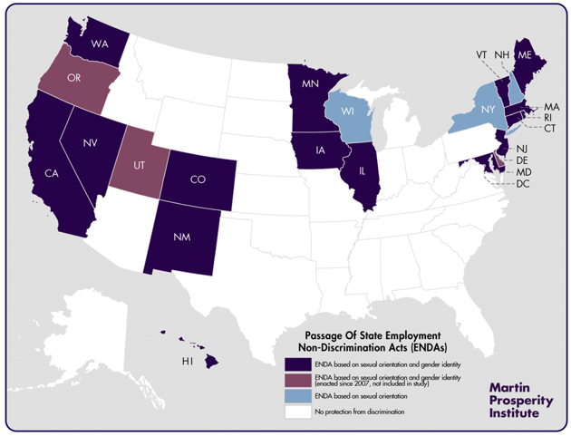 The study takes great care to rule out factors that might confound the effects of these non-discrimination laws, such as the overall economic performance and talent levels of states, the size of their LGBT populations, and their political orientations. Furthermore, the study looks closely at the effects of laws passed at earlier versus later time periods, and even compares states with ENDAs to neighboring states that do not have them, to make sure it is getting at the precise effect of gay-friendly states on innovation.