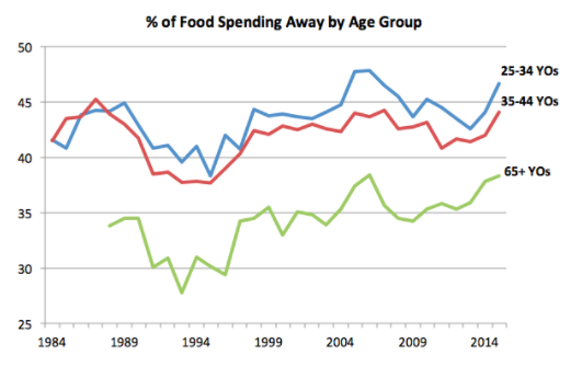 I wondered if the Millennial slow shift toward restaurants was unique. So I added two more age groups to the picture--Gen-Xers (older thirtysomethings and younger fortysomethings) and senior citizens.