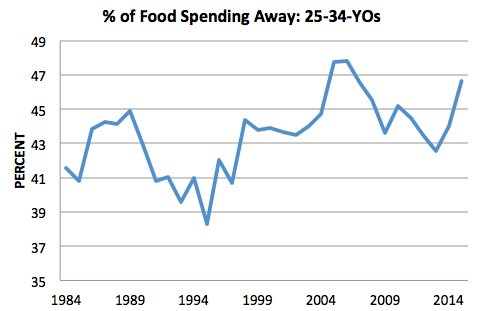 Although it is always emotionally satisfying to blame young people for wrecking the world order, the shift in Millennial food preferences is not exclusive to Millennials. Using data from the Consumer Expenditure Survey, a division of the Bureau of Labor Statistics, here is a graph showing restaurant spending (technically: “food away from home”) as a percent of total food spending for older Millennials—25-34-year olds. This is not a sudden shift toward restaurants, so much as a halting, start-and-and-stop move away from groceries and food at home, which still accounts for the majority of Millennial food spending.