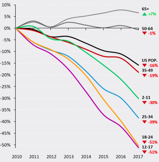 If one graph could possibly explain this entire deal, this one does. It shows change in traditional-television viewing time in the last eight years.