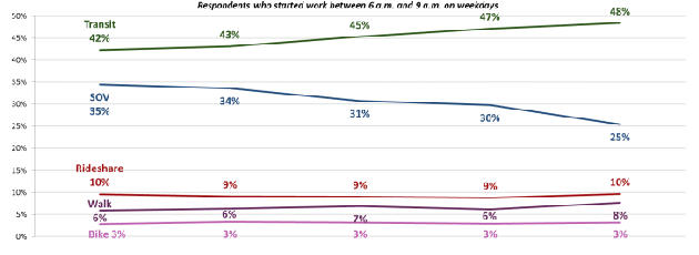 But thanks in part to efforts by the region’s largest employers, the share of commuters driving solo into downtown Seattle is on a dramatic decline. Just 25 percent of workers traveling into the city’s center drove themselves, according to the results of the latest annual commuter survey by the Seattle Department of Transportation (SDOT) and its nonprofit partner, Commute Seattle. This is the lowest share since the city started keeping track in 2010.