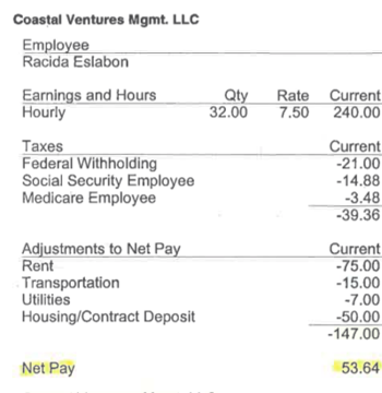 When Eslabon arrived in Florida, nothing was as she thought it would be. Coastal Ventures Management told Eslabon that she had to pay another $250 dollars as a deposit for housing, according to Eslabon and the DOL certification. (Multiple efforts to reach Coastal Ventures representatives for comment went unanswered. And despite providing Eslabon with a certification for immigration purposes, the DOL has not pursued any enforcement action against Coastal Ventures, according to Eslabon’s attorney. Coastal Ventures has since dissolved its LLC.)
