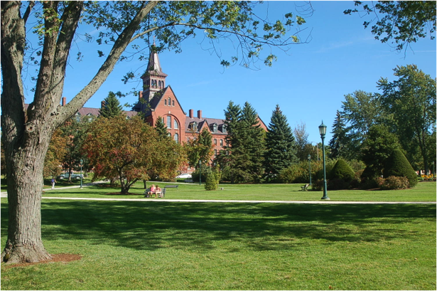Only a couple miles from UVM, over in nearby Colchester, is St. Michael’s College, which doesn’t have the national profile of UVM, but is very successful in its own niche: it’s a fine Catholic liberal-arts college with about 2000 undergraduates. Founded by Edmundite priests in 1904, St. Michael’s has a welcoming, ecumenical tone that harmonizes to the humanist tenor of the Burlington metropolitan area. If you walk around this campus and talk to its students and faculty, as I did, you get the sense that this attractive, congenial community is serious about trying to offer its students what it calls a “transformational experience.” [Below, campus green at St. Michael's College.]