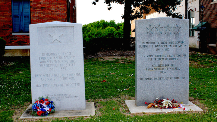 Memorial stones in downtown Starkville, county seat of Oktibbeha County, Mississippi, and home of Mississippi State University. On the left, one honoring Confederate soldiers, erected in 2005. On the right, one honoring Union soldiers, erected in 2006.