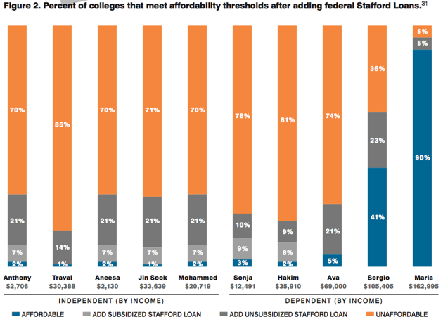 For instance, without loans, the poorest dependent student IHEP considered could only reasonably afford 3 percent of the colleges the report analyzed. Factoring in loans, the situation is better, but the student would still only be able to afford about 20 percent of the colleges.