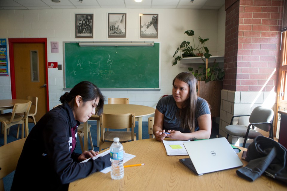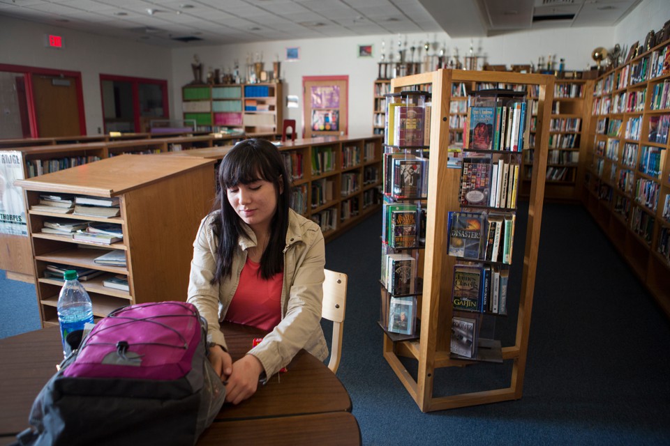 Mousseau was working on an assignment for her Native-studies class—using colored pencils to shade in a map of different indigenous populations “before the white people came”—when I approached her in the campus’s small, sunlit library to see if she wanted to chat. Pushing her backpack aside to clear the table, she shrugged. “Sure,” she said without making direct eye contact. With a slight smirk and black bangs nearly covering her eyes, the 18-year-old explained that she only recently moved to Pine Ridge from Pierre and had spent nearly her entire life in the foster-care system.