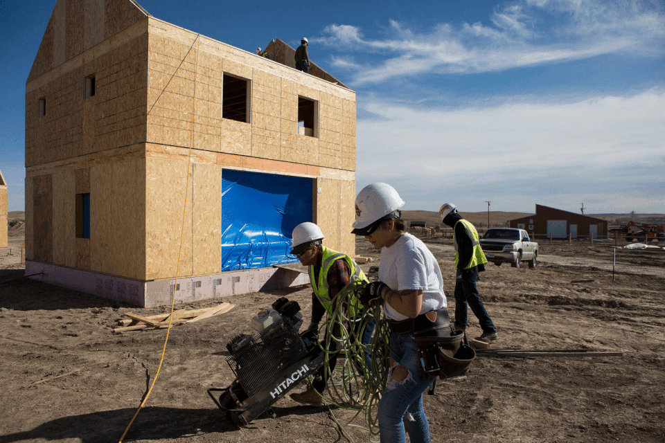 “We really try to arm them with not just construction skills, but [also] coping skills,” Andrew Iron Shell, Thunder Valley’s community-engagement coordinator, told me as he showed me around the construction site in the town of Porcupine one blustery morning. “Yeah, it’s nice we’re going to have a physical structure, but the process is way more powerful … That just gives people something to hang on to. There are not a lot of success stories that people here see every day.” Off in the distance sat several unfinished two-story houses, blue tarps blowing in and out of the holes that would soon become doors and windows. The slap of the sheets was met by the sounds of tractors and hammers; a few trainees were lifting wooden pillars into one of the homes.