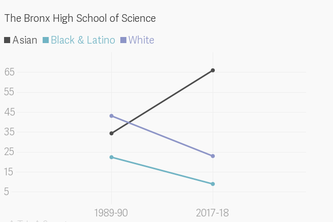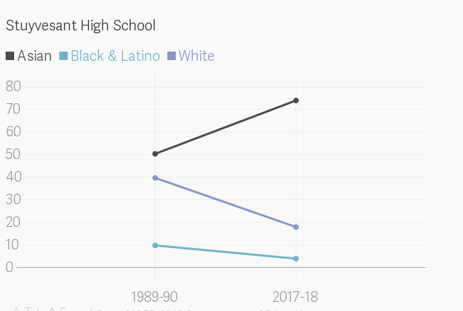 *Because of errors in the data kept by the National Council of Education Statistics, this article originally stated that black and Latino students made up 16 percent and 67 percent of the student bodies at Stuyvesant and Brooklyn Tech, respectively, in the 1989-1990 school year. This article, including its charts, has been updated to reflect corrected data from the NCES. A separate error in the chart for Bronx Science, in which the wrong percentage of Asian students was given for the 1989-90 school year, has also been corrected.