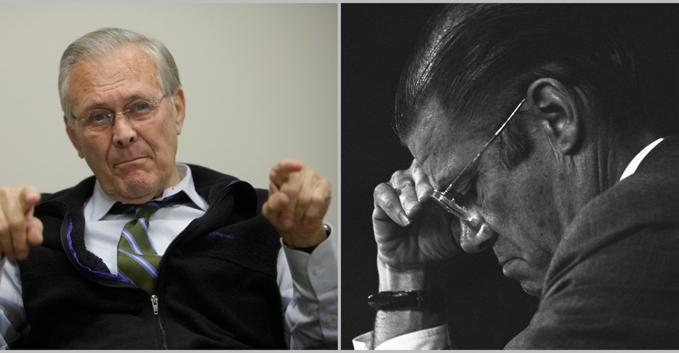 McNamara’s determination to leave a legacy that might somehow prevent a repeat of history—an American engagement in a war that would fail to achieve honorable objectives and a democratic denouement—will no doubt be in the back of many viewer’s minds as Morris’s newest film, The Unknown Known, rolls out in theaters (and, simultaneously, on-demand from cable outlets and iTunes). In his new movie on Rumsfeld, Morris’s approach is very much the same as it was with McNamara. His off-camera voice poses questions and, amid archival clips and original musical soundtracks, the subjects reveal personalities that are riveting in their differences.