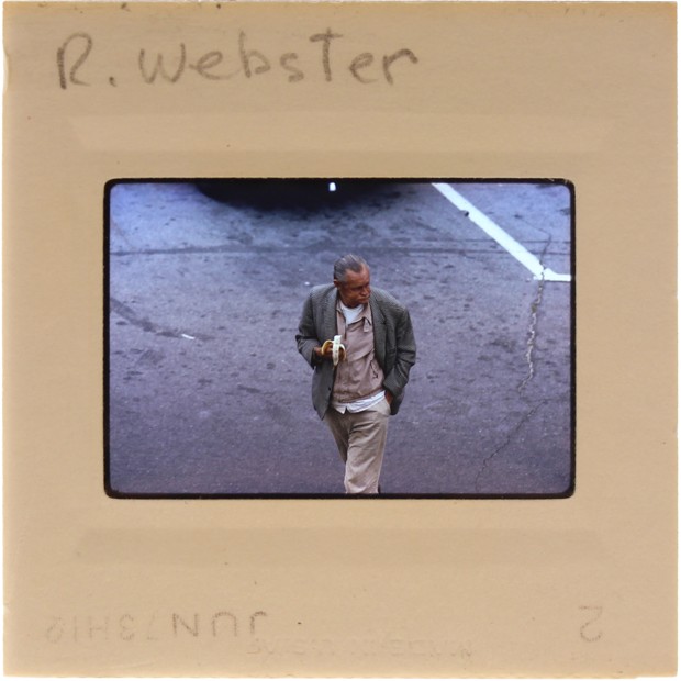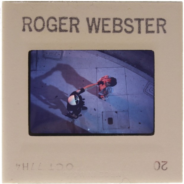 Perhaps in the spirit of 1970s campus transformation, universities actually bought these images, mixing EC’s radically de-centered transparencies into their conventional collections. Imagine, slide one: A row of Victorian houses, perched primly on Bunker Hill. Click. Slide two: Two bikini-clad cyclists hang outside a Venice Beach dry cleaner in broad afternoon light. Click. Slide three: downtown’s Dorothy Chandler Pavilion, in all its austere elegance. Click. Slide four: On a sidewalk bathed by a reddish street lamp, a young man with outstretched arms confronts a police officer.
