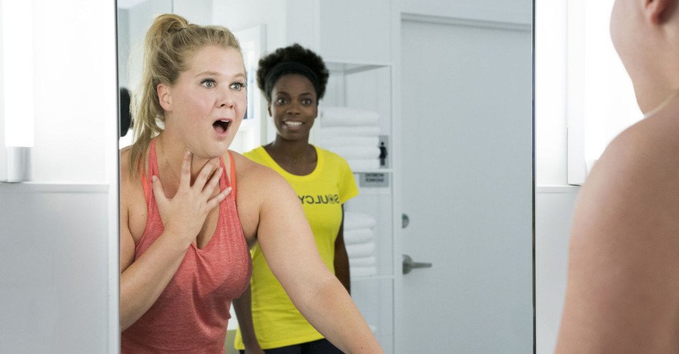 The plot in essence (and it never moves meaningfully beyond that): Renee Bennett (Schumer) works in a basement office, tending to the web site of the cosmetic company Lily LeClaire. Insecure about her looks, she joins a SoulCycle class in which she suffers multiple humiliations—she splits the crotch of her leggings and breaks her bike! Get it?—before eventually falling off the cycle altogether and hitting her head. Miraculously, now when she looks at herself in a mirror, she sees not her old self, but rather a version of her that is the most beautiful woman in the world. (More miraculously still, she never asks herself how this transformation might have taken place.)
