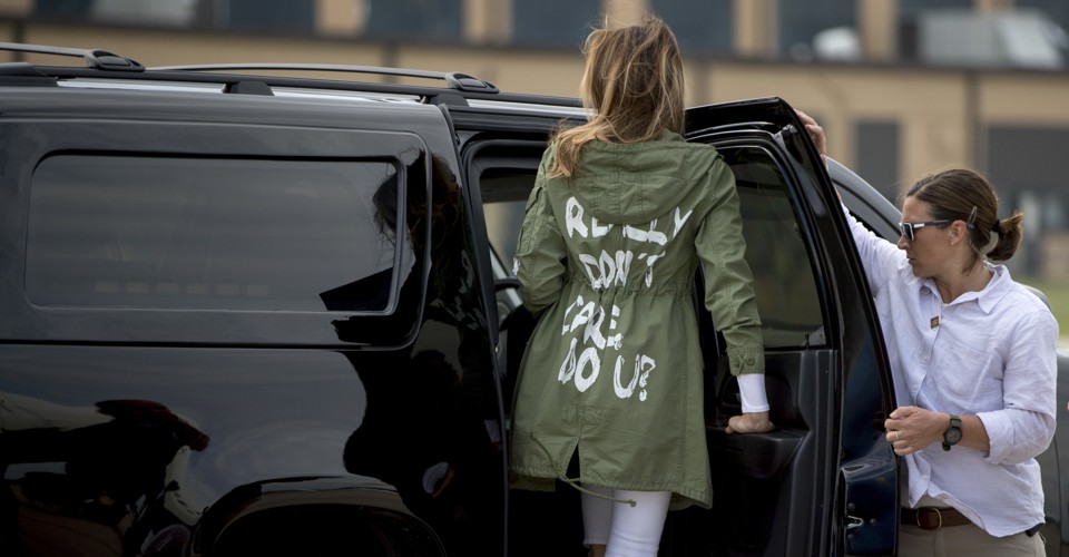 It started, as controversies so often will, with fast fashion. On Thursday, as Melania Trump made a hastily planned trip to McAllen, Texas, to visit migrant children being kept in a holding facility at the Mexican–American border, she donned an olive-green anorak, gathered at the waist, that was printed on the back with the following words, seemingly painted in white: “I REALLY DON’T CARE, DO U?”