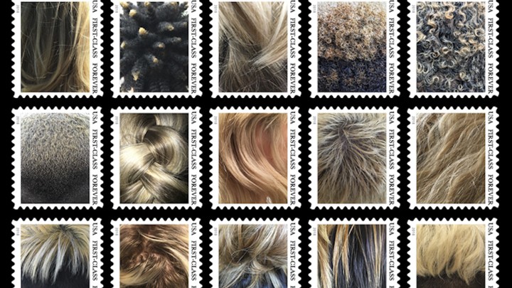Though the artists didn’t ask subjects to identify their race or ethnicity, Stamped features interviews with people from an array of backgrounds. Along with audio from on-the-ground conversations and ingredient lists for blond hair dye marking the gallery’s windows, the exhibit displays photographs, some shrunken to fit onto real postage stamps.These images offer close-ups of bleached-blond hair, often sharply contrasting with the wearer’s darker roots growing through.