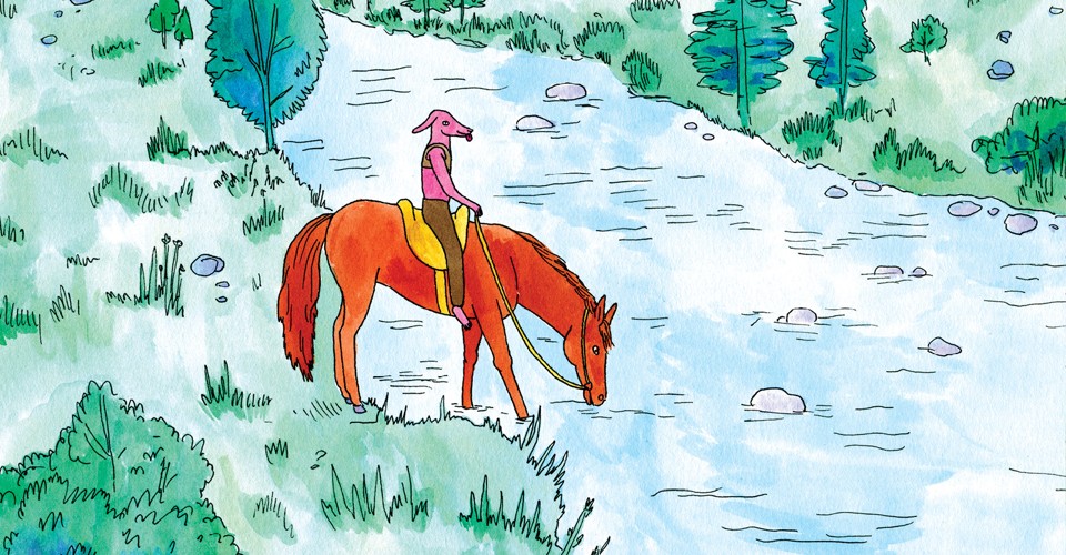 Hanawalt’s illustrations do a lot of the work to visually disassociate Coyote Doggirl from its black-and-white or sepia-toned predecessors. Close to sunset, the sky in Coyote Doggirl is filled with cotton-candy-pink clouds; in the day, it glows the color of a ripe lemon. The mountains and pebbles and trees are often a smudged indigo. Sometimes the background vanishes altogether, homing in on Coyote’s ecstasy as she takes a new horse for a spin, or on her mindlessness as she performs chores. (Not everything is rendered so delightfully: A traumatic memory materializes in washes of deep blues and blacks—and then a sickening ribbon of crimson.) For fans of the artist’s comics or BoJack Horseman, it’s an unmistakable aesthetic. Hanawalt’s soft-edged watercolors complement the looseness of the narrative, which is linear but interspersed with playful detours and snapshots of Coyote’s inventory (harmonica, rations, rope, revolver).