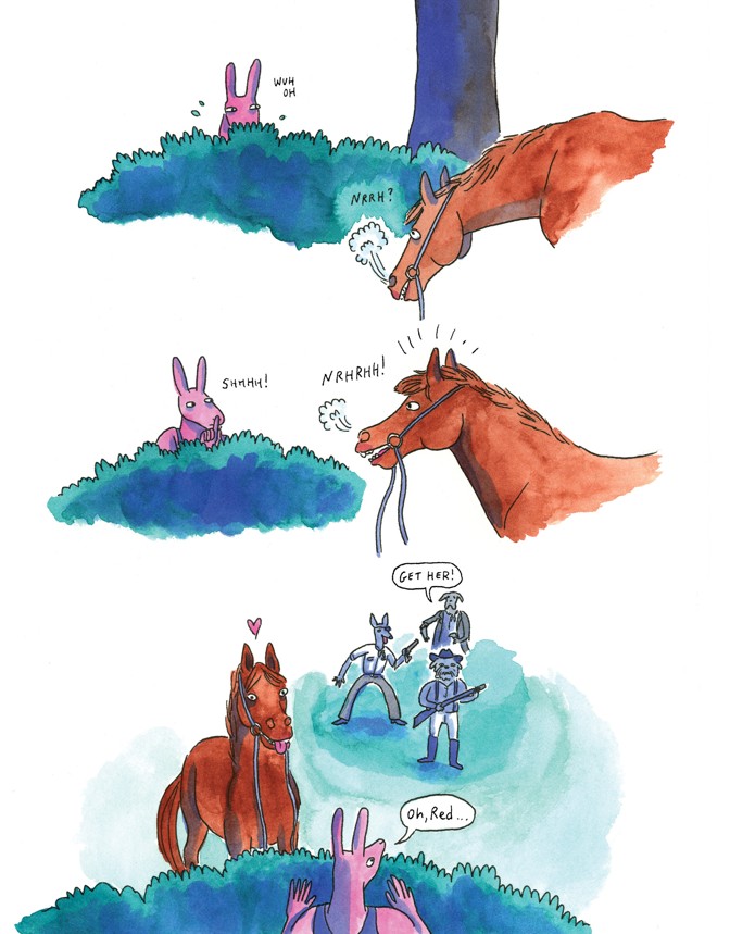 Of course, while Coyote Doggirl herself may know nothing about Western genre conventions, that’s certainly not the case for Hanawalt, who’s best known for her work as the production designer of the acclaimed Netflix animated series BoJack Horseman. “I love Westerns so much, but they’re often really racist and misogynist,” Hanawalt said during a 2015 festival talk. “I wanted a surreal, horse-focused Western with dog people in it. I couldn’t find an example of that, so I made it.” Coyote may seem childlike at times, but Hanawalt never lets readers forget that this is, in the end, the story of a horse-obsessed cowgirl being chased by a vengeful posse of men who want to kill her.