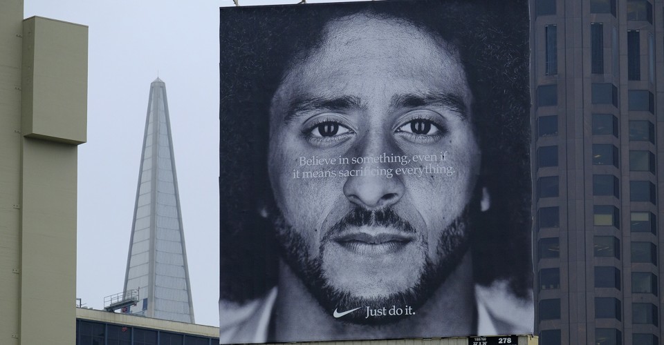 Monday afternoon, the former San Francisco 49ers quarterback Colin Kaepernick tweeted a tightly cropped grayscale photo of his face, emblazoned with a simple message: “Believe in something. Even if it means sacrificing everything.” Below Kaepernick’s lips, the Nike logo accompanied the company’s pithy slogan: “Just do it.”