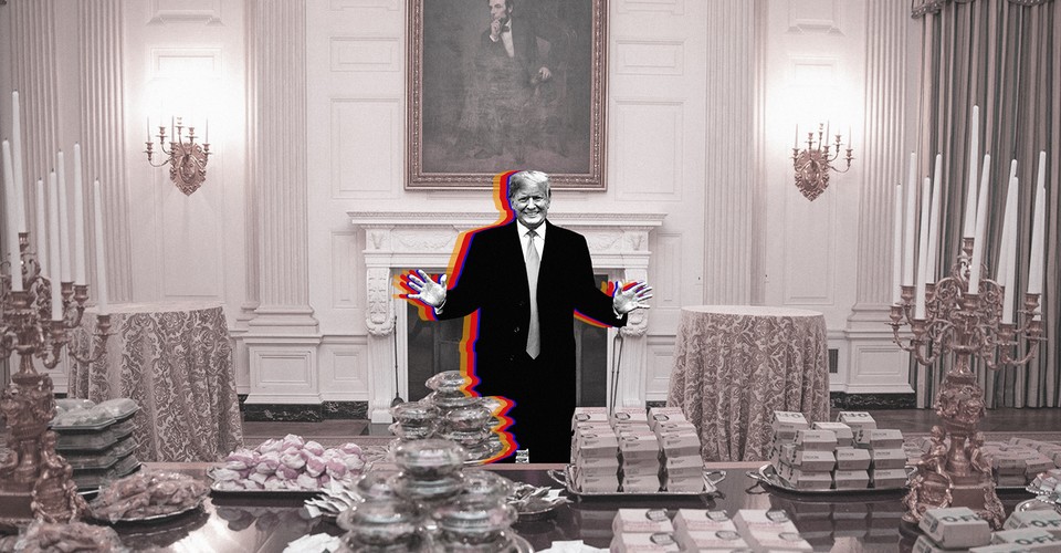 The answer was as evident as the silver-plattered salads: This was a thoroughly Trumpian strain of spectacle, its images meant to hijack attention and go viral. The president invited members of the press into the State Dining Room on Monday, before the diners were invited in, to take photos and shoot video of the tablescape, rendering an otherwise ordinary White House event—a victorious athletic team, rewarded with a presidential visit—into something remarkable. And the feast that ensued (“great American food,” Trump called it), was the distillation of some of his fondest visions of the country: corporate, homogeneous, teasing, unapologetic, and revolving, above all, around the whims of Donald Trump. Images of the president, presiding over piles of cardboard-boxed burgers, quickly attained their virality; there was pretty much no way for them not to. Trump bragged like so about his own role in the procuring of these postmodern loaves and fishes: “Because of the Shutdown I served them massive amounts of Fast Food (I paid), over 1000 hamburgers etc. Within one hour, it was all gone. Great guys and big eaters!”