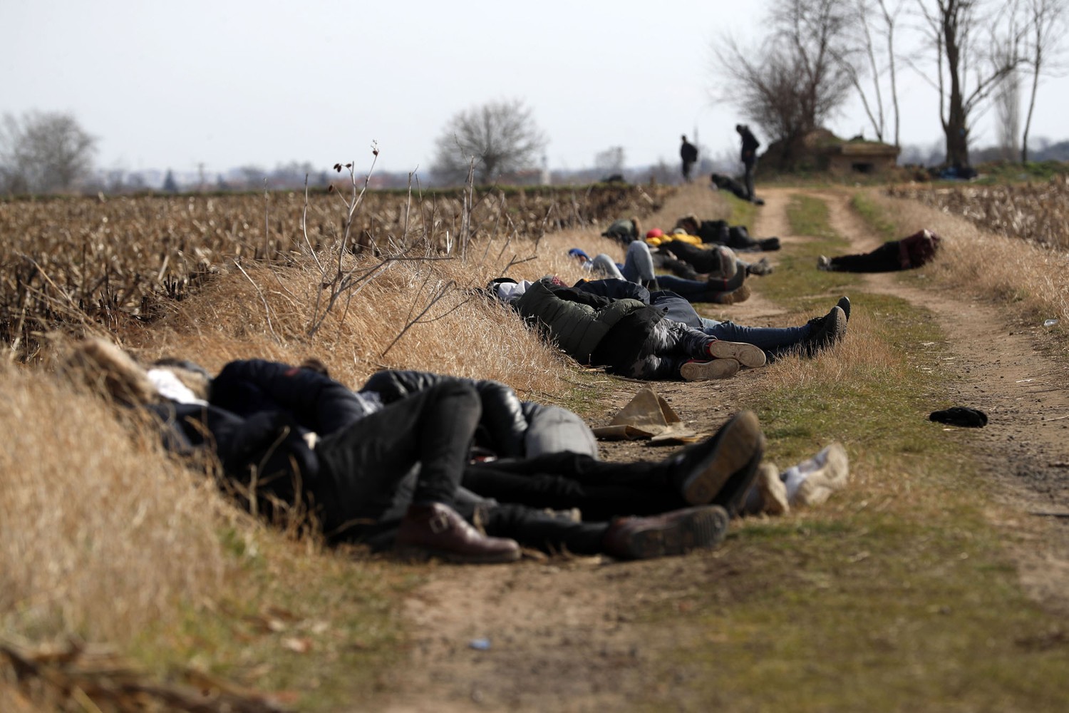 24. Migrants sleep near the Pazarkule border gate at the Turkey-Greece border in Edirne on March 2, 2020.