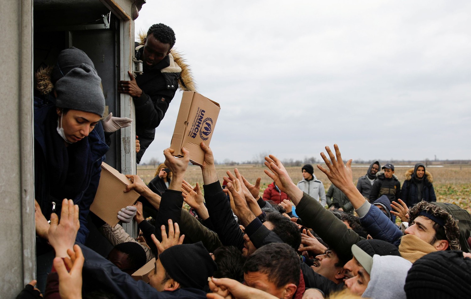 11. Members of the United Nations High Commissioner for Refugees agency deliver food to migrants at Turkey's Pazarkule border crossing on February 29, 2020.