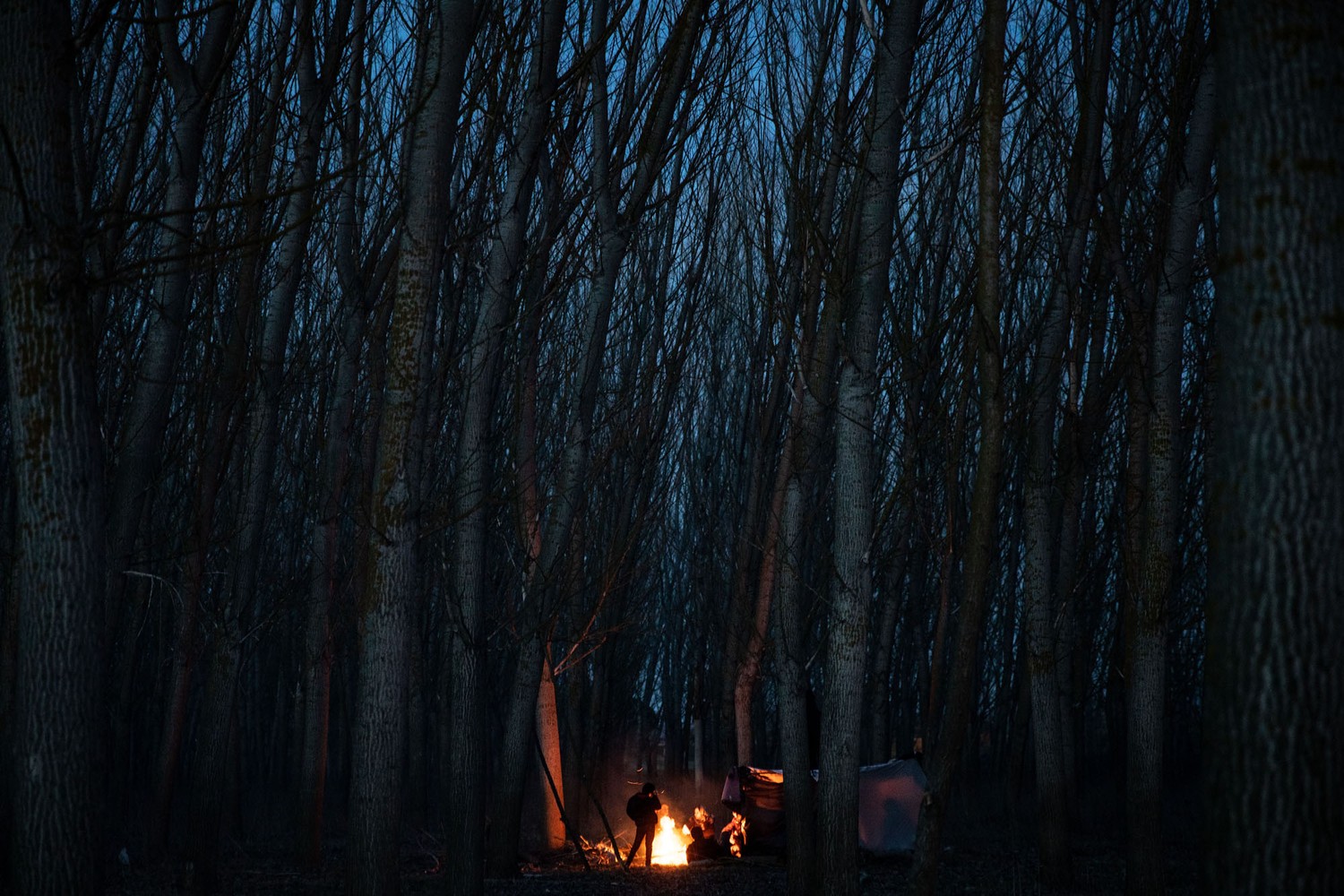 23. Refugees and migrants sit around a fire on the Turkish shoreline of the Evros river on March 1, 2020.