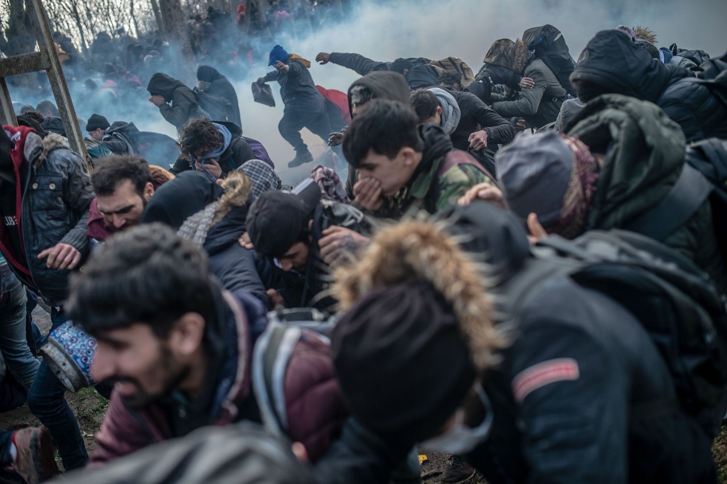 21. Migrants cover their face to avoid tear gas thrown by Greek security forces on March 2, 2020.