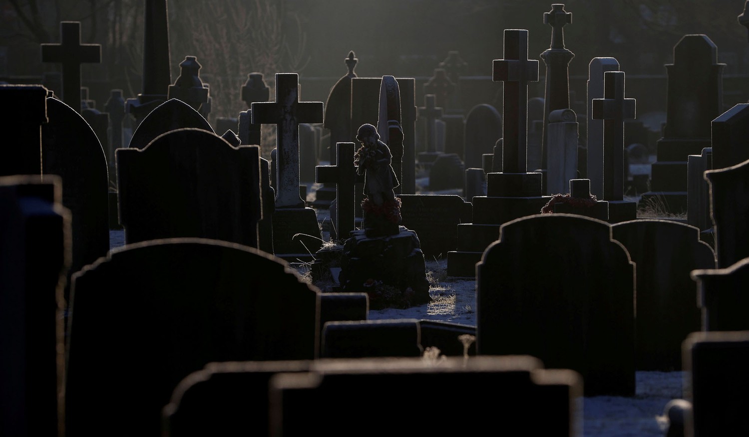 3. Sunlight hits frost-covered headstones in a graveyard in Manchester, England, on January 25, 2021.