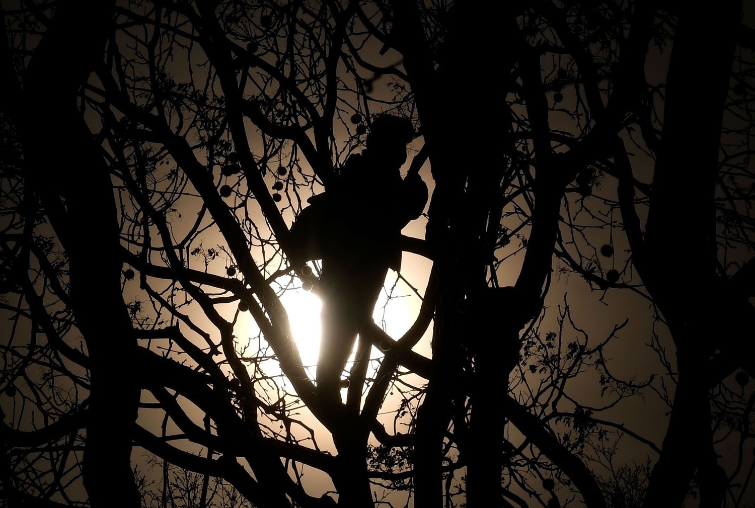 2. An Extinction Rebellion activist is seen silhouetted on a tree at Euston Square Gardens to protest against the HS2 high-speed railway, in London, England, on January 28, 2021.