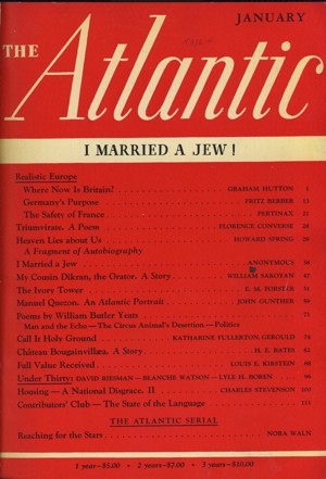 Purcell’s article—with its descriptions of her WASP-y manners and martini-making skills, its reference to the archetype of the “motorcycle-driving, leather-jacket wearing ‘bad boy,’” and its superficial handling of Jewish identity—has the feel of a personal essay from another era. And, in fact, a contributor tackled the same subject for The Atlantic almost 80 years ago, in an essay for our January 1939 issue simply and provocatively titled “I Married a Jew.” The author of that essay, whose identity was kept secret, reflects on her relationship with love and some pride, even as she delves into the religious and ethnic tensions that make it fraught.